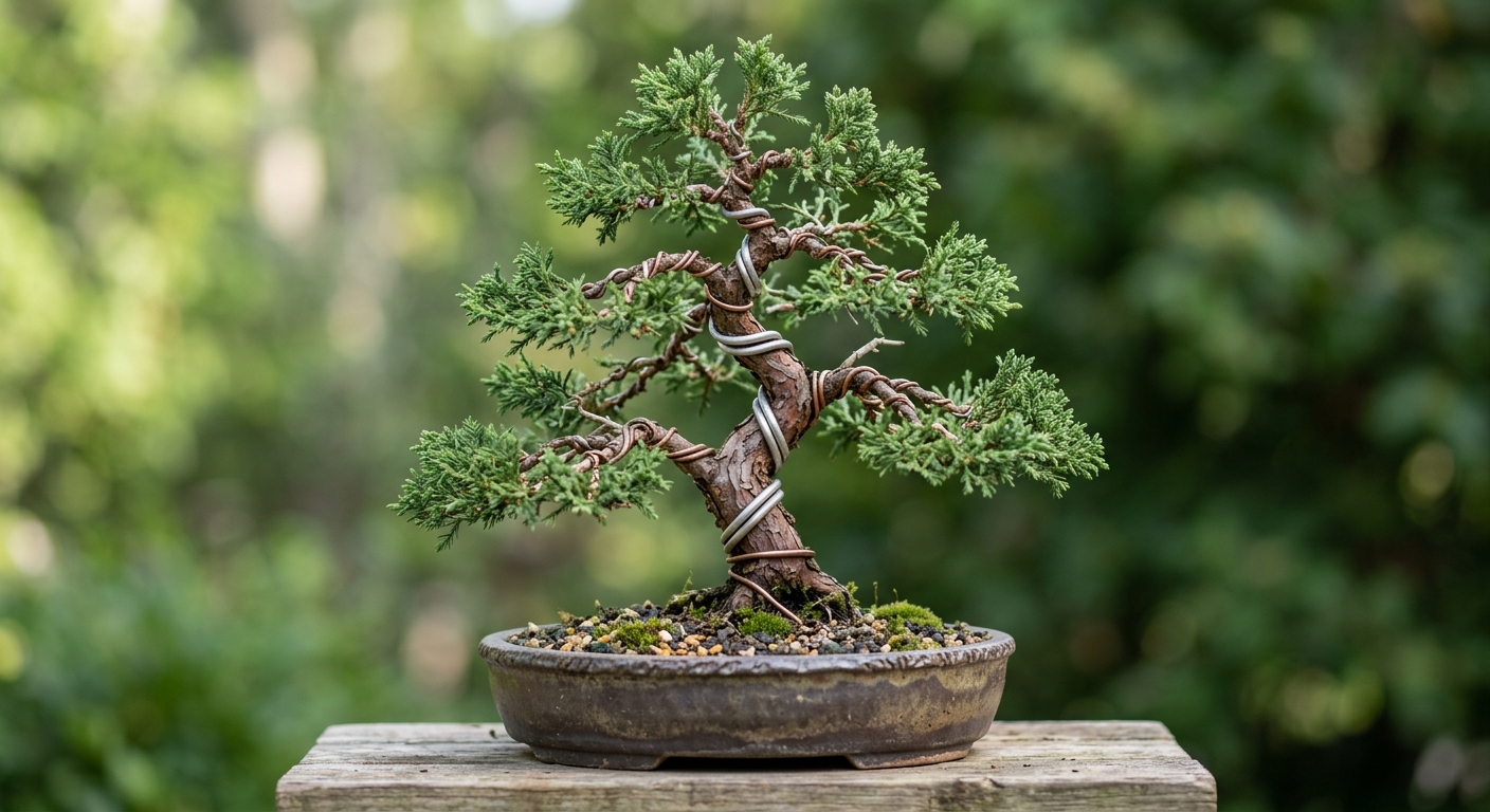 真柏に不必要な針金を巻くと、若い枝が枯れる原因となることがあります。特に不自然な位置に枝を作ろうとする場合は注意が必要です。アルミ線は一度曲げると形が戻りにくいため、曲げたい位置を正確に決めてから作業します。