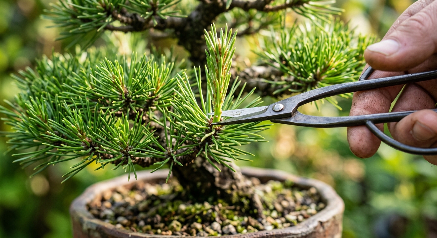黒松の芽かきでは、芽が上下に重なって残る「縦二分」は原則として避けるべきです。上の芽だけが強く伸びて樹冠の輪郭を乱し、下の芽が弱って将来的に不要な枝になるためです。芽は水平方向にV字型に2本残すのが基本です。