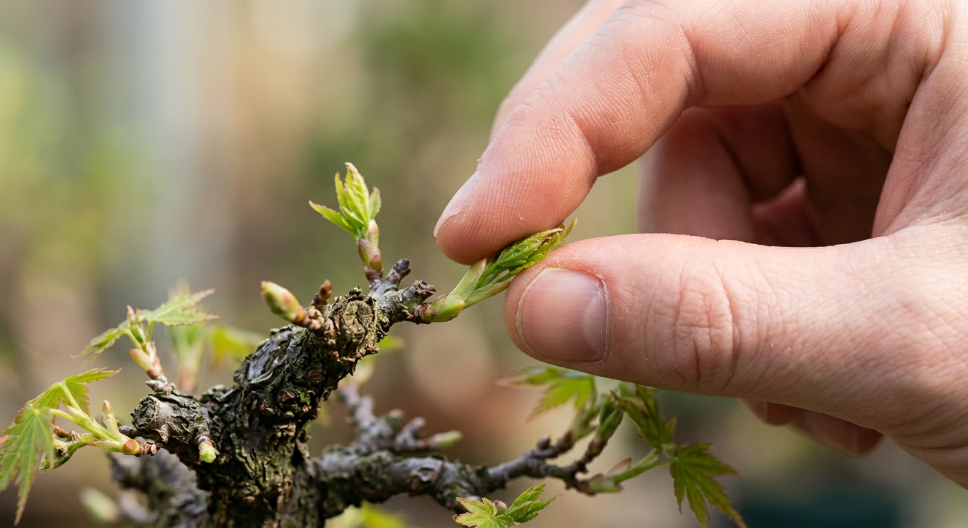 * 残す芽の数: 赤松では、新芽が3本以上に枝分かれしている場合、2本を残します。五葉松でも、多数の芽が出ている場合は最も強い芽を摘み、左右の2つの芽を残します。ヤマモミジでは、新芽を2葉残して芽摘みします。