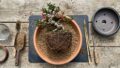 4号鉢の場合、同じ4号または一回り大きい5号鉢にそっと植え替えます。植え付け後は盆栽が動かないよう、鉢の底穴から針金を通し、根鉢を上下から挟むようにして固定します。