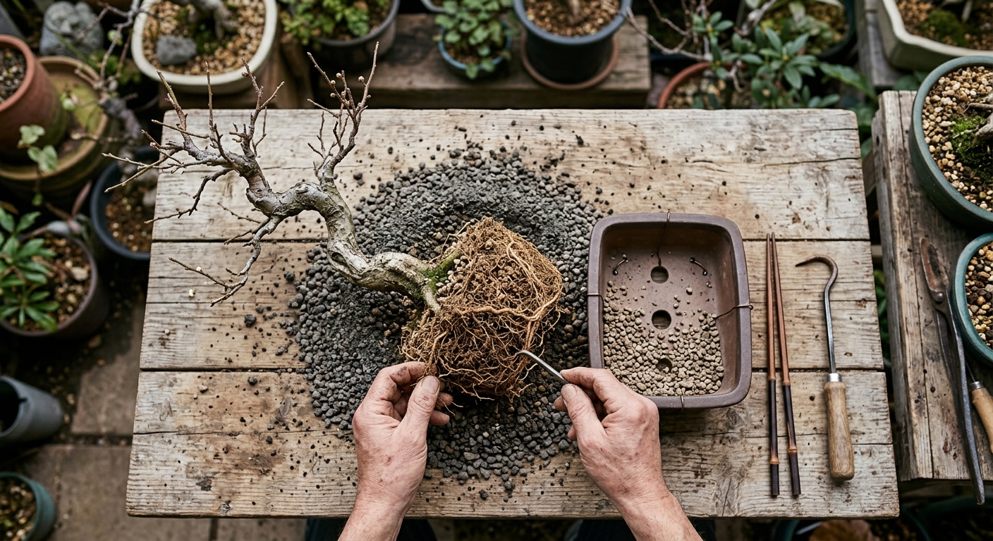 開花を控えた梅の盆栽を植え替える際は、根の扱いを慎重にします。根鉢を大きく崩さず、軽くほぐす程度に留めることが、開花への影響を最小限に抑えるコツです。新しい根がスムーズに馴染むのを助けます。