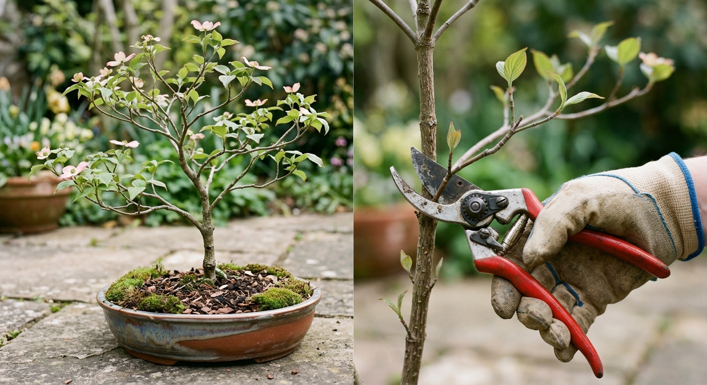 ハナミズキ本来の三角形の樹形を保つように、伸びた分だけを優しく剪定します。枝の分かれ目で、切り口が下を向くように切ると、見た目がきれいに仕上がります。