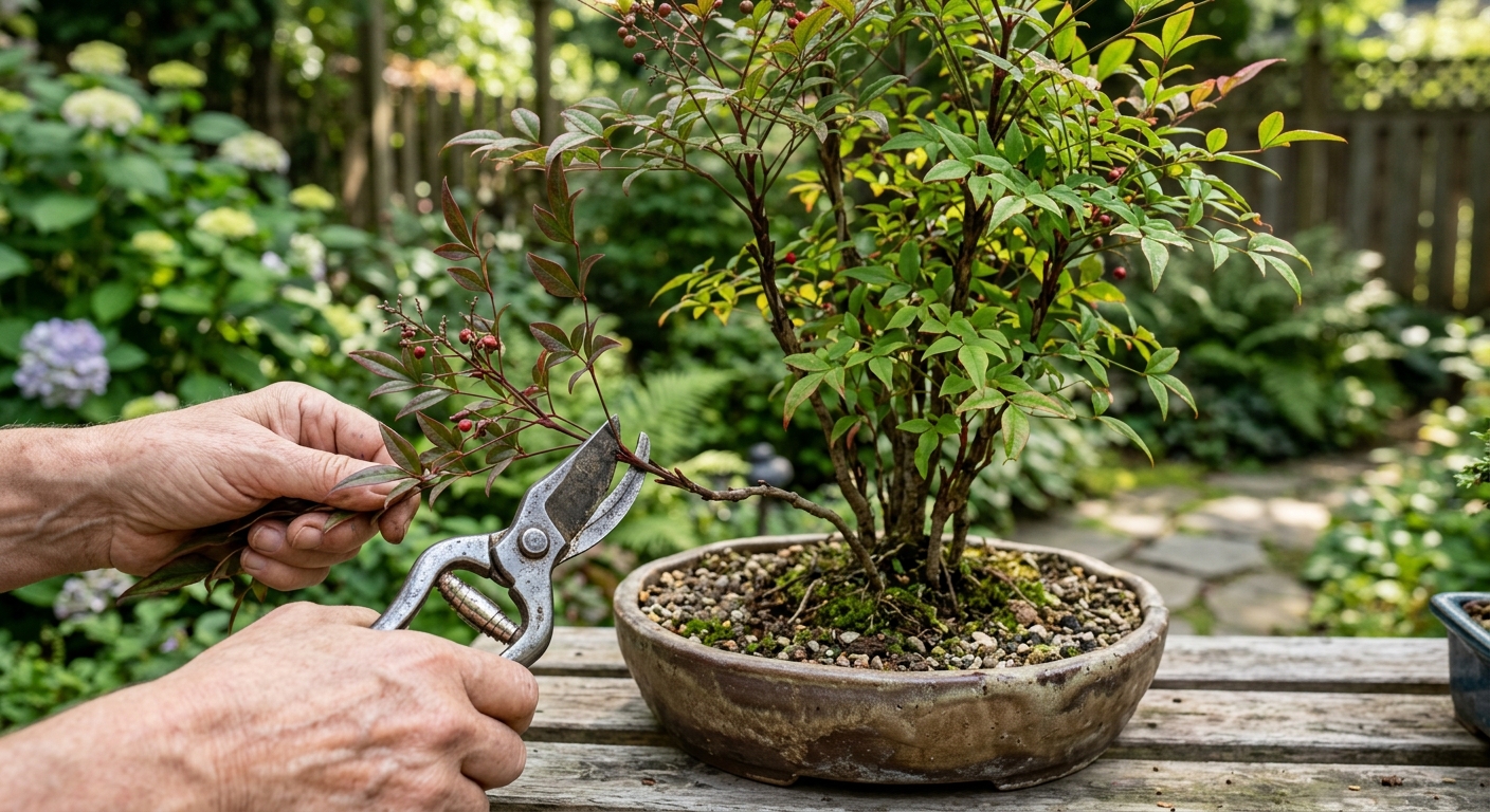 キンシナンテンの剪定は、樹形を美しく保ち、病害虫を防ぐために行う作業です。放置すると上に伸びすぎて不格好になるため、定期的な手入れで枝葉の密度を調整します。適切な剪定によって、風情のある自然な樹形を維持し、株を健康に保つことができます。