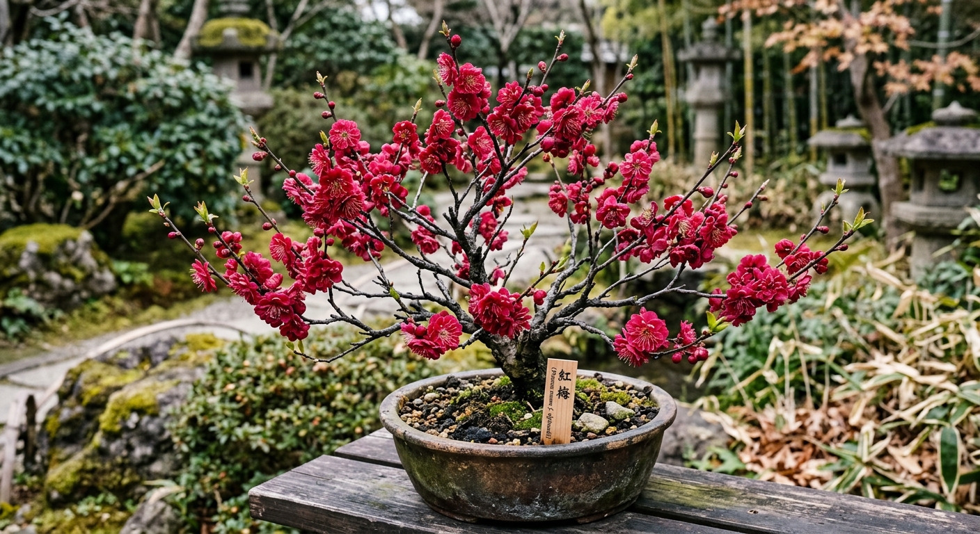 特徴 紅梅は早春に芳香のある鮮やかな紅色の花を咲かせ、古木感のある樹皮が盆栽としての風格を高めます。成長は旺盛で枝打ちがしやすく、花後の剪定によって美しい樹形を維持できるため、初心者から愛好家まで広く親しまれています。