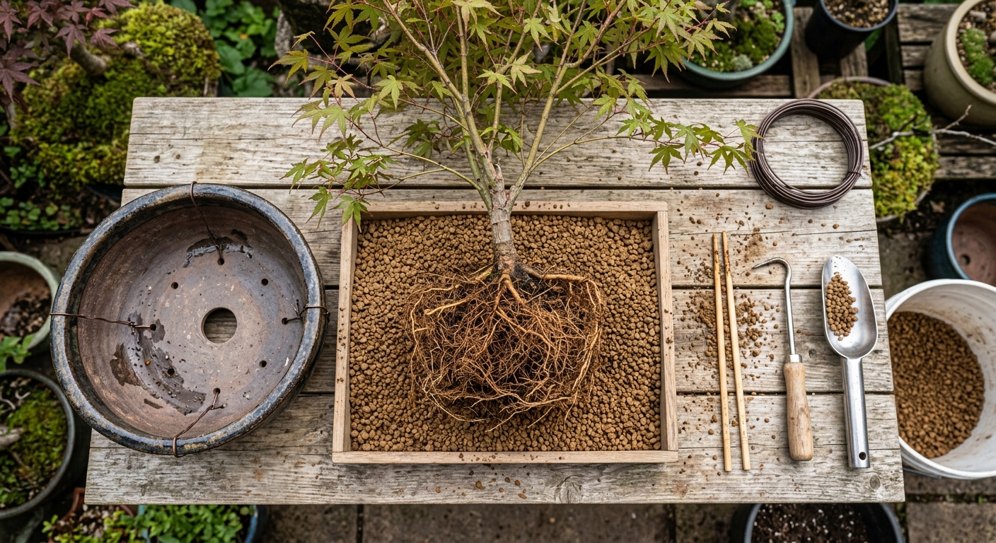 植え替えの際は、将来完成させたい鉢のサイズを明確にイメージします。そのサイズに合わせて根を切り詰めることで、細根の発生が促され、良い根張りが形成されます。