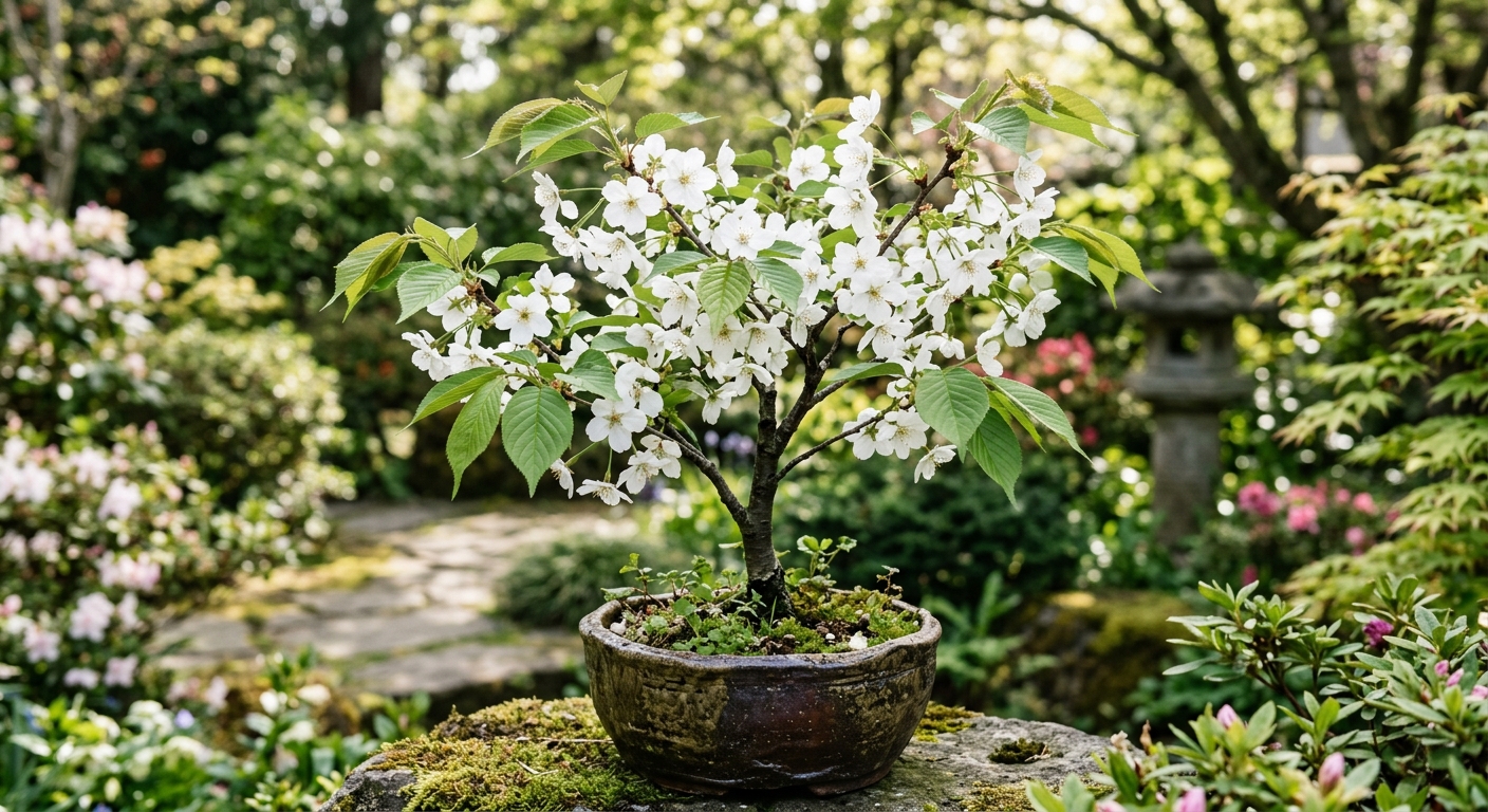 | 特徴 | オオシマザクラは成長が早く、若木のうちから純白で芳香のある花を咲かせるのが魅力の樹種です。葉が花と同時に展開し、その爽やかな緑と花のコントラストが美しく、盆栽として非常に見栄えがします。 |