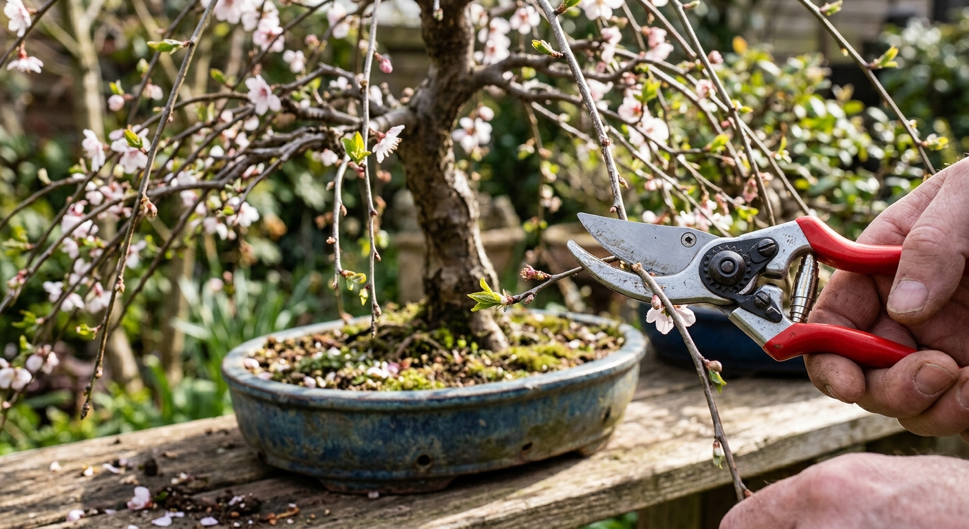 枝先(ミクロの視点)では、上向きの芽を先端に残すことで、枝が一度上へ伸びてから垂れ下がるようになります。このひと手間が、枝垂れ梅特有の優雅な樹形を作ります。一方で、枝が上下に重なっている場合は、下の枝を取り除くとすっきりとした印象になります。