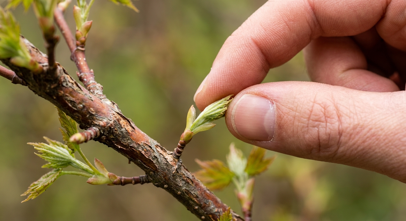 3月頃から芽吹く新芽は、2葉を残して芽摘みします。また、ハカマ取りと呼ばれる作業も効果的です。ハカマ取りは、まだ新芽がハカマに収まっていて葉が伸びていないうちに行うのが最適なタイミングです。この作業により、軸が外気に触れて固まり、短い小枝が形成されやすくなります。